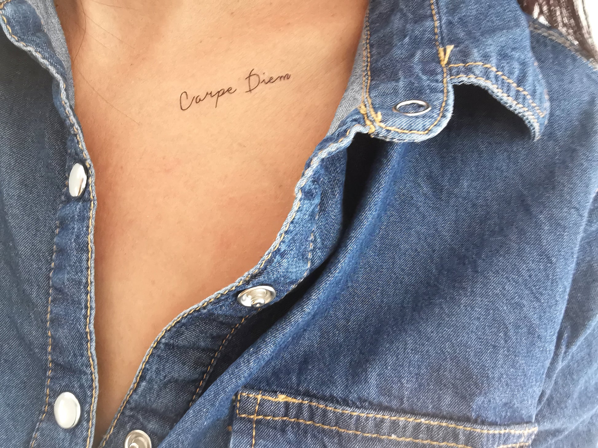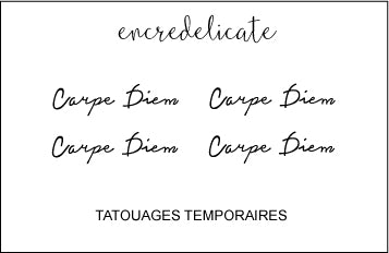 Tatouage temporaire de la maxime Carpe diem qui signifie profites du jour (lot de 4) . Comme dit la chanson " profites du jour ou meurs en regrettant le temps que tu as perdu". Ce tatouage minimaliste inspirant saura te séduire par sa fine écriture cursive.