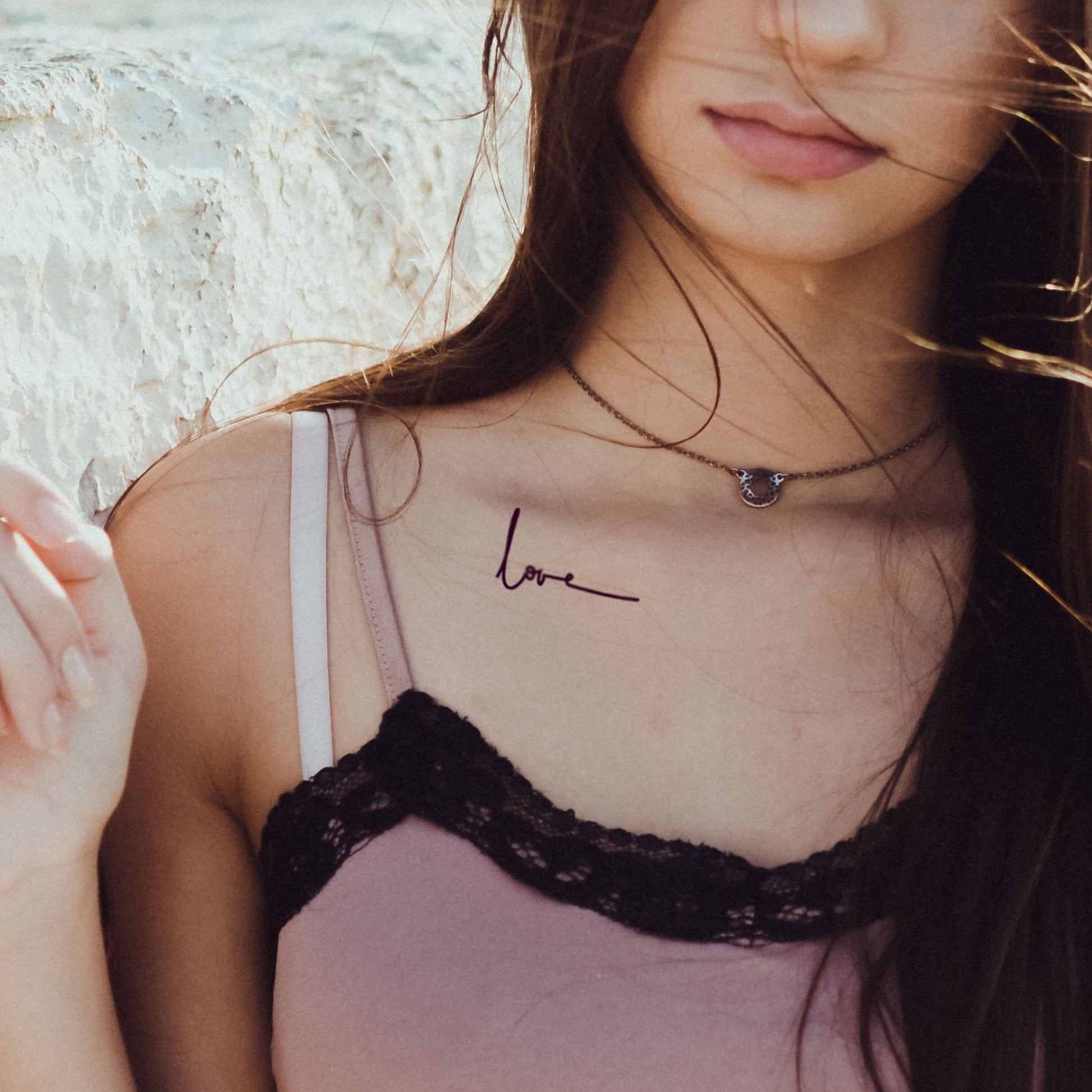Tatouage temporaire inspirant du mot love pour dire je t'aime (set de 3). Dimension du tatouage environ 3,2 cm (1,3"). Une notice d'explication est fournie à chaque envoi.