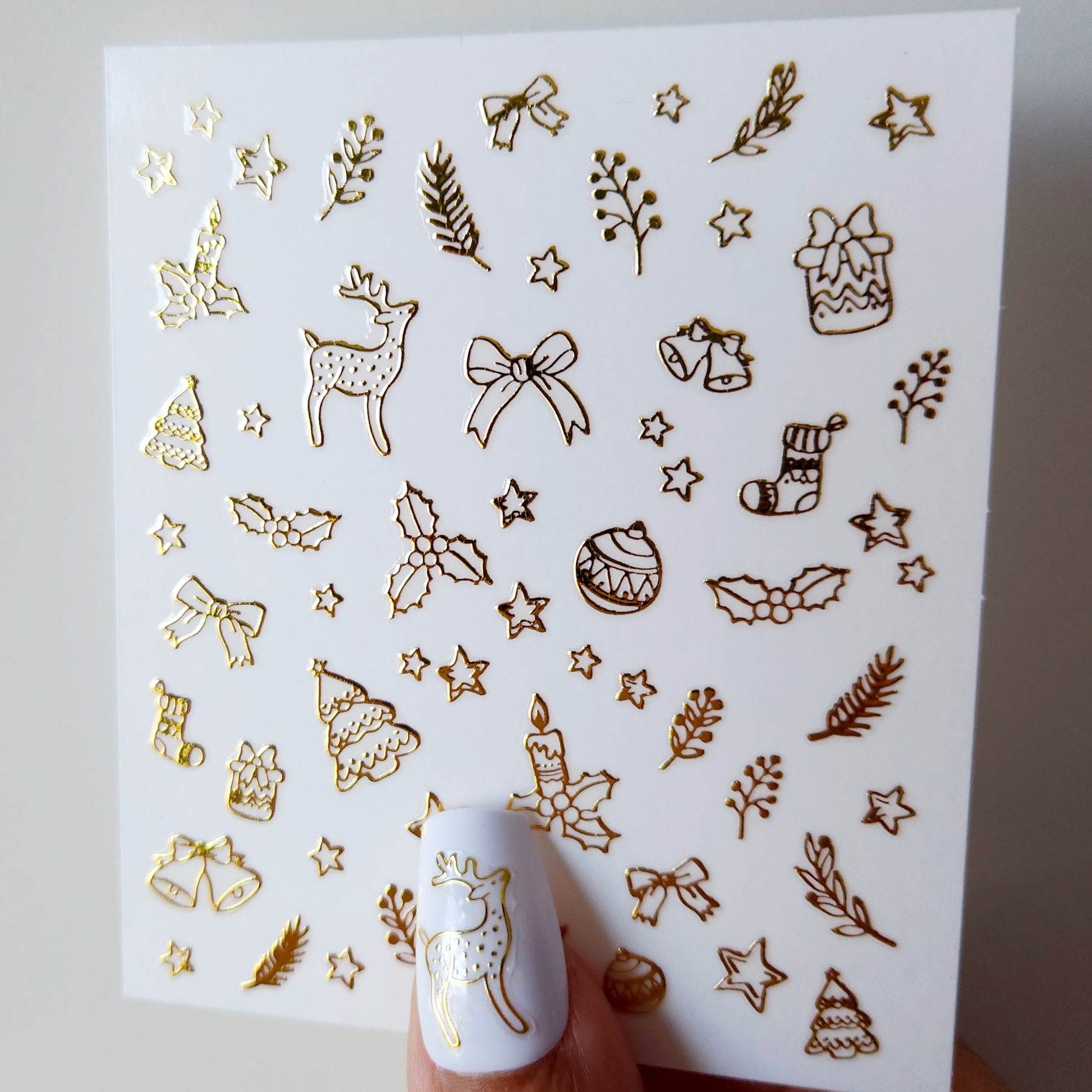 stickers ongles Noël avec des rennes, des sapins, des flocons de neige, du houx, des boules de Noël et des cadeaux. Pour avoir une manucure éblouissante pour les fêtes et sans prise de tête pour appliquer, composez le nail art que vous voulez avec ces autocollants pour ongle très facile à poser. Dimensions de la feuille : 7,8 x 9 cm (3 x 3,5")