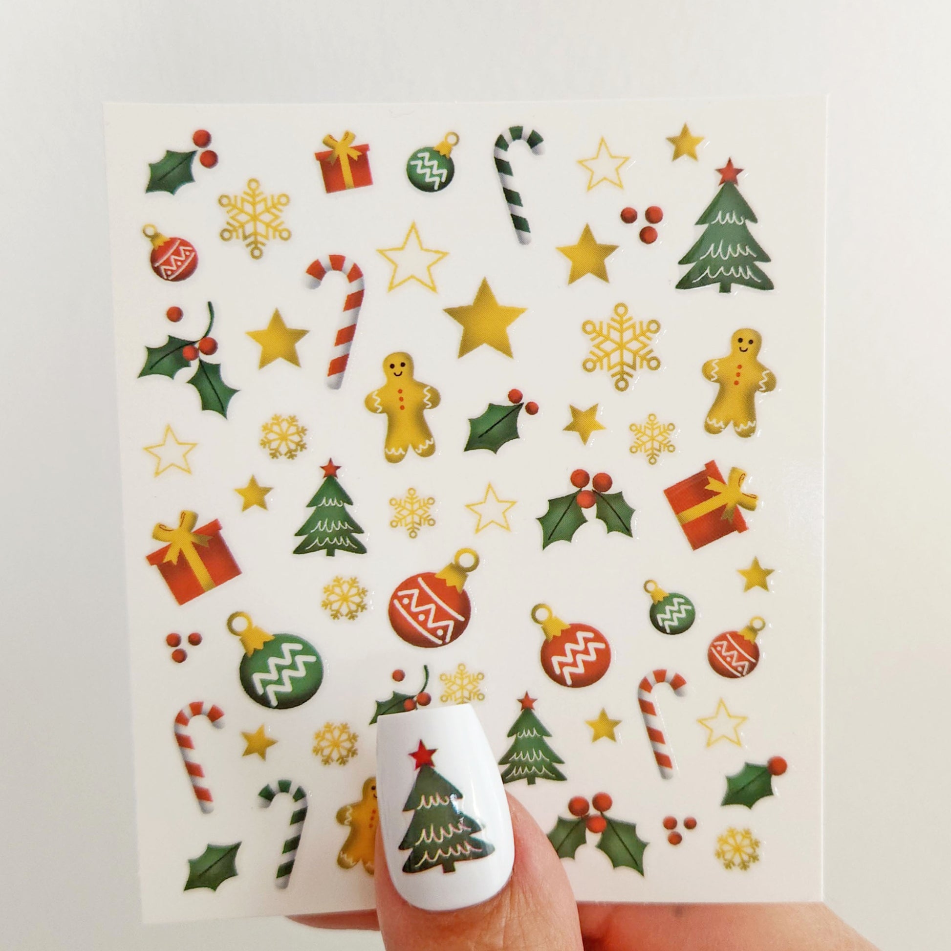 stickers ongles Noël avec des pains d'épice, des sapins, des canne bonbons, des flocons de neige, du houx, des boules de Noël et des cadeaux. Pour avoir une manucure unique pour les fêtes et sans prise de tête pour appliquer, composez le nail art que vous voulez avec ces autocollants pour ongle très facile à poser. Dimensions de la feuille : 7,8 x 9 cm (3 x 3,5")