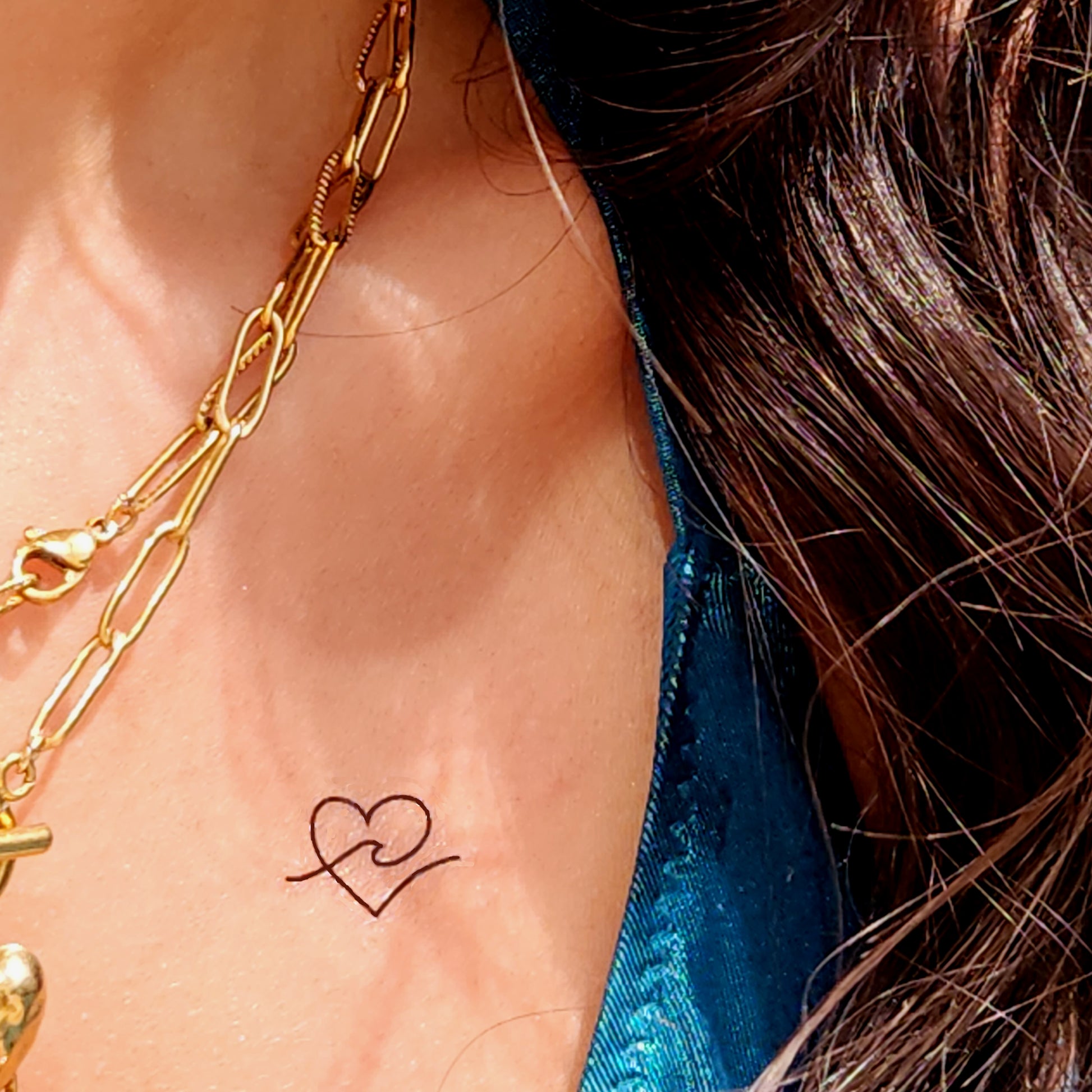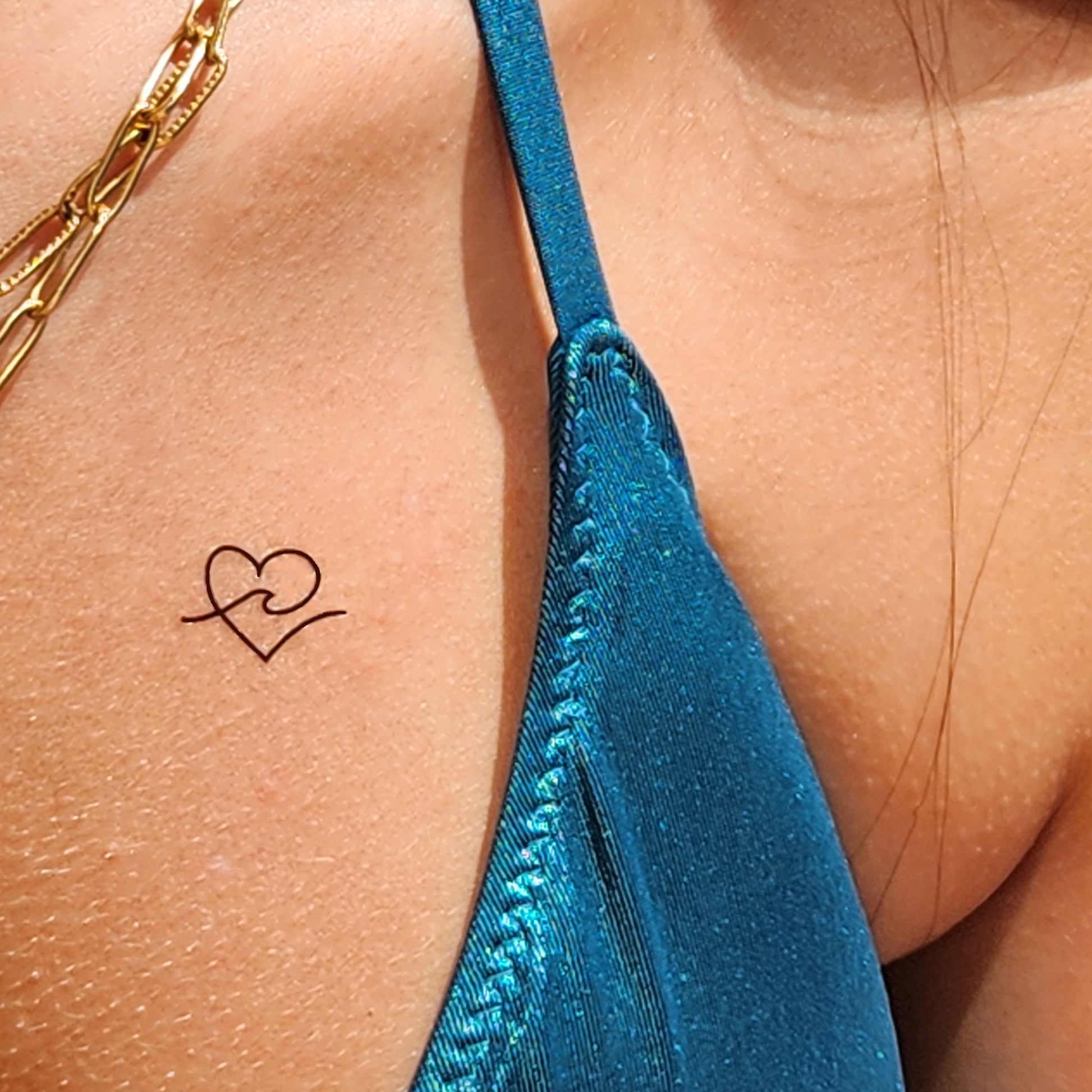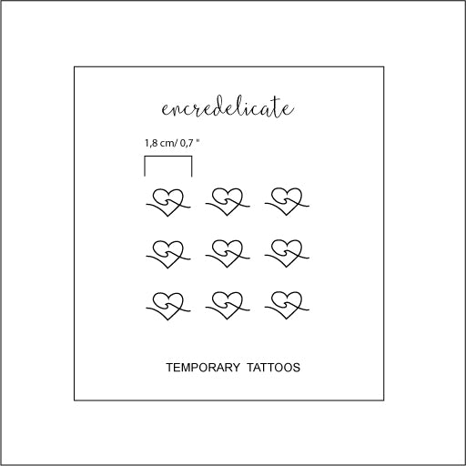 Tatouages temporaires de coeur avec une vague (9 tatouages). Dimension environ 1,8 x 1 cm. Une notice d'utilisation est donnée à chaque envoi. Le tatouage dure 2 à 5 jours suivant s'il s'agit d'une zone de frottement.