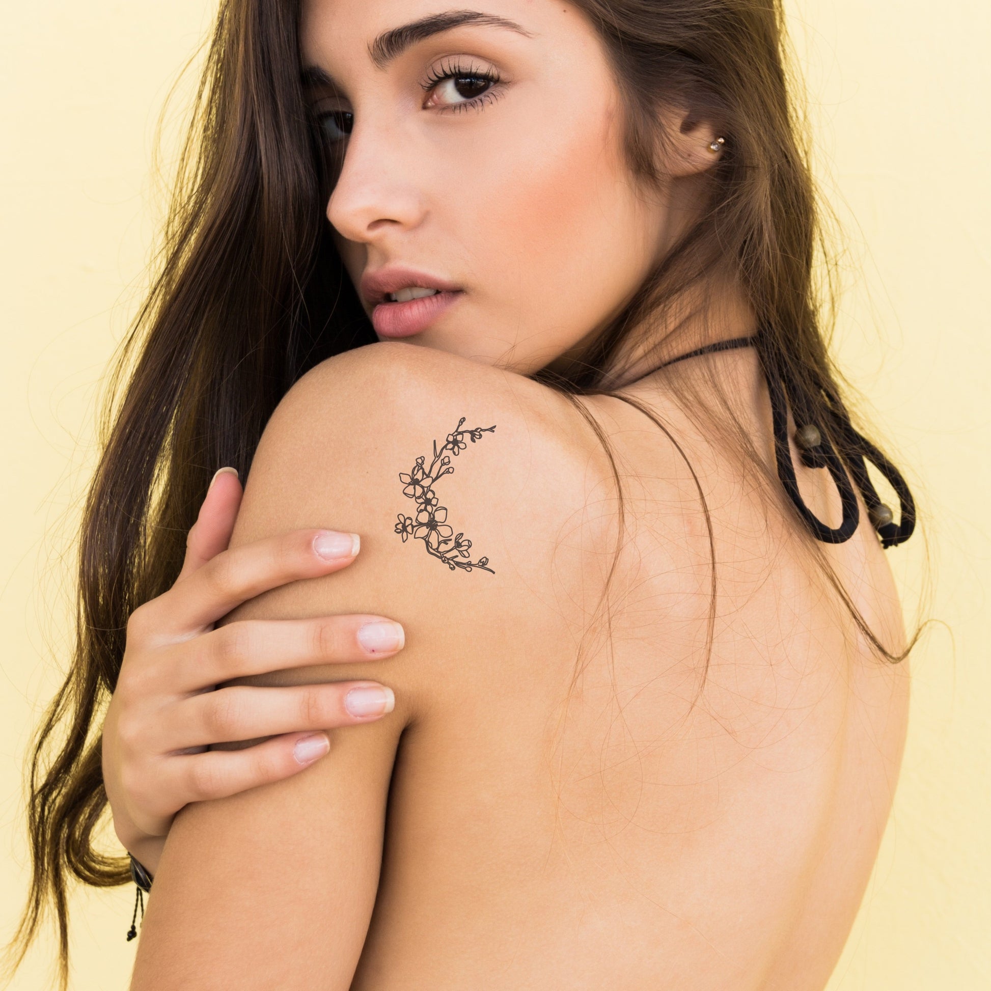 Tatouage temporaire de lune dessinée à la main avec des fleurs simples en noir.