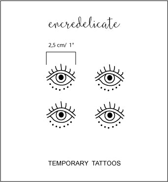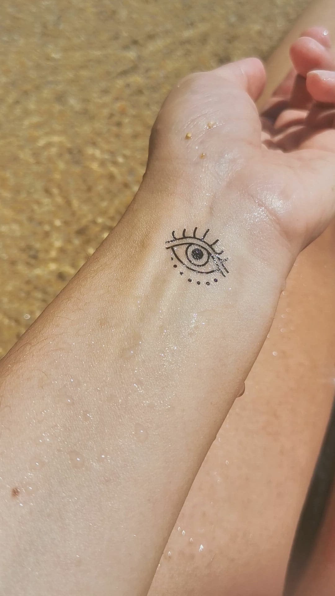 Tatouage temporaire minimaliste du troisième oeil en noir ou evil eye tattoo. Ce tatouage discret est très tendance. C'est aussi bonne idée de tatouage pour porter entre copines ou soeurs.