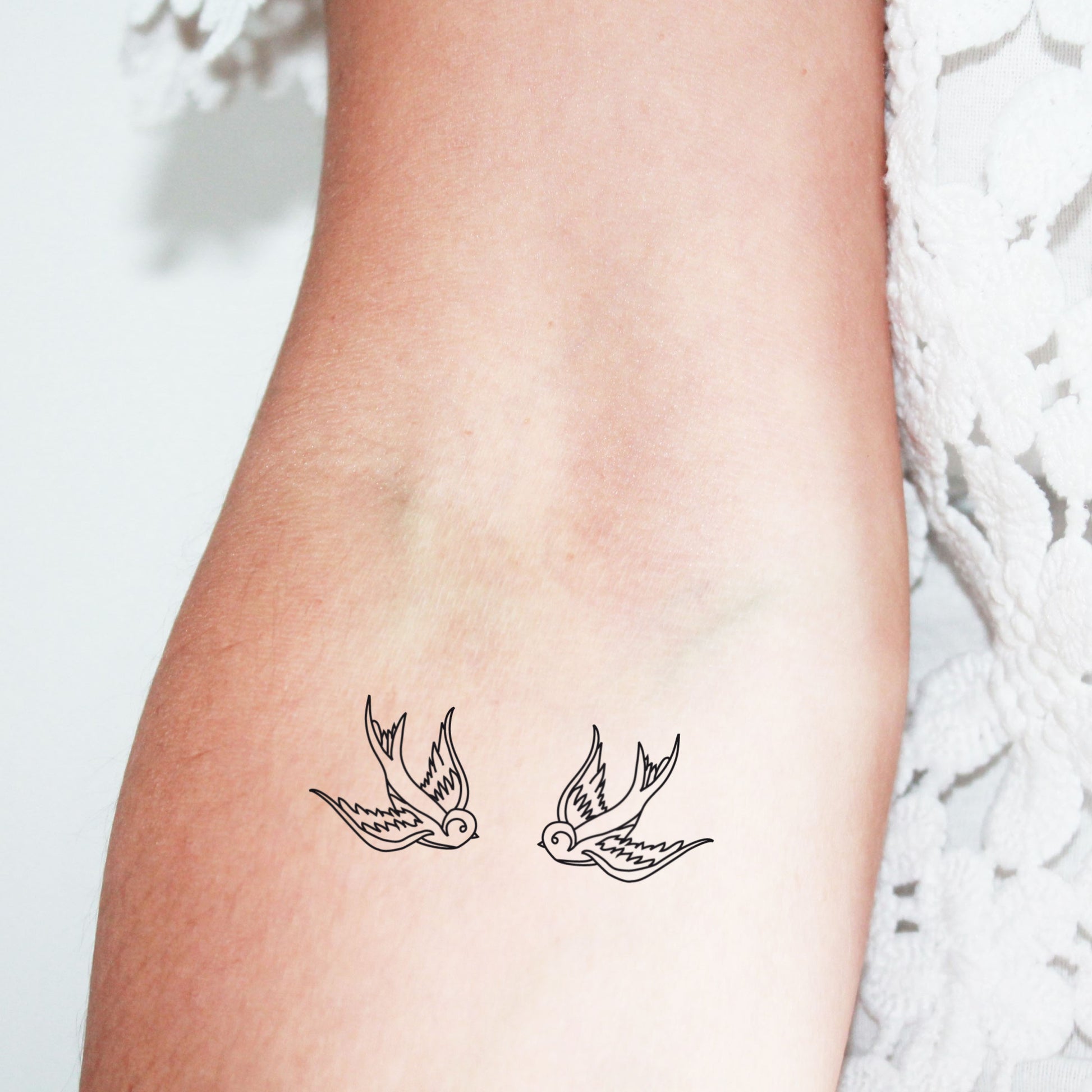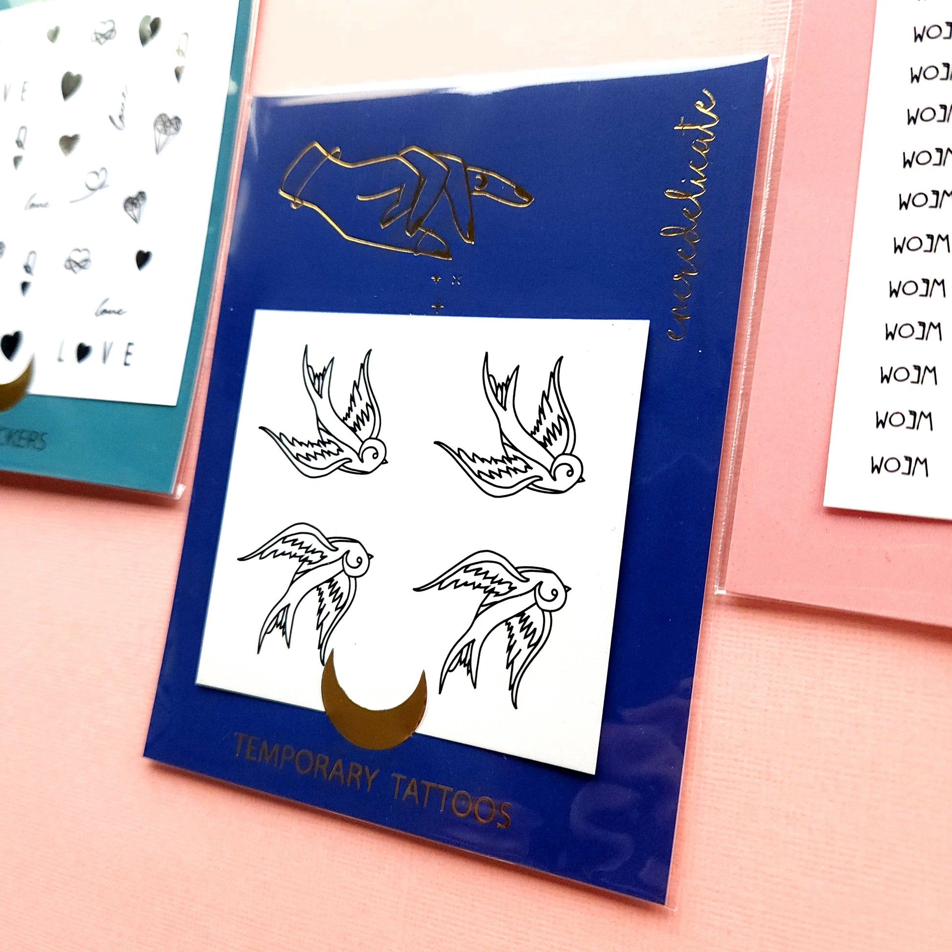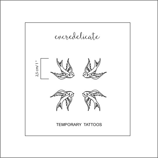 4 tatouages temporaires d'une hirondelle dans le style Old School. tatouage sensuel et féminin d'une hirondelle qui effleure la peau. Craquez pour nos tatouages temporaires Old School, inspirés par l'âge d'or du tatouage.