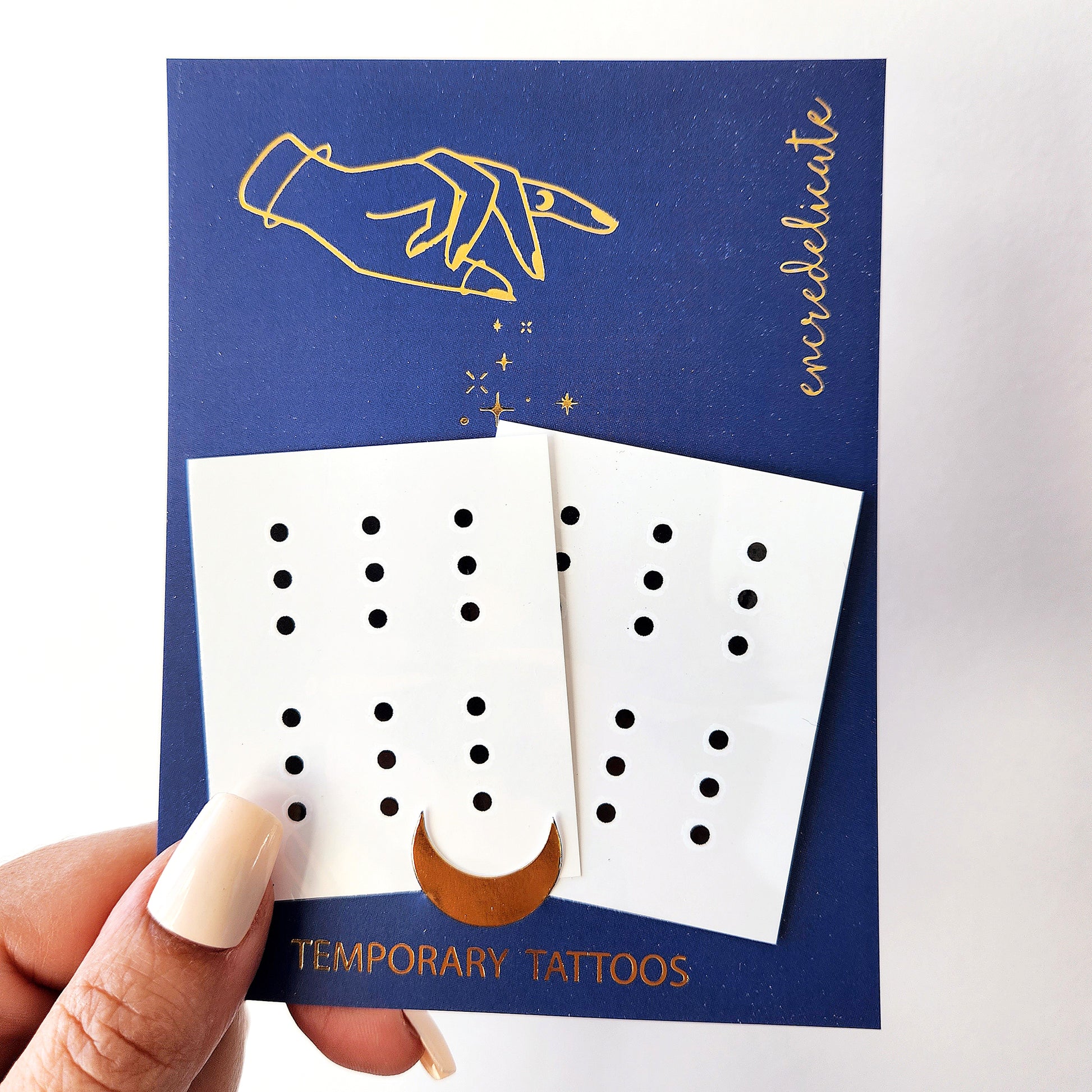 La dimension du tatouage est de 1,6x0,3 cm environ. Chaque point fait environ 0,3 cm de diamètre. Set de 6 tatouages. Le tatouage est de qualité et dure entre 3 jours et une semaine. Une notice d'utilisation est envoyée dans votre commande.