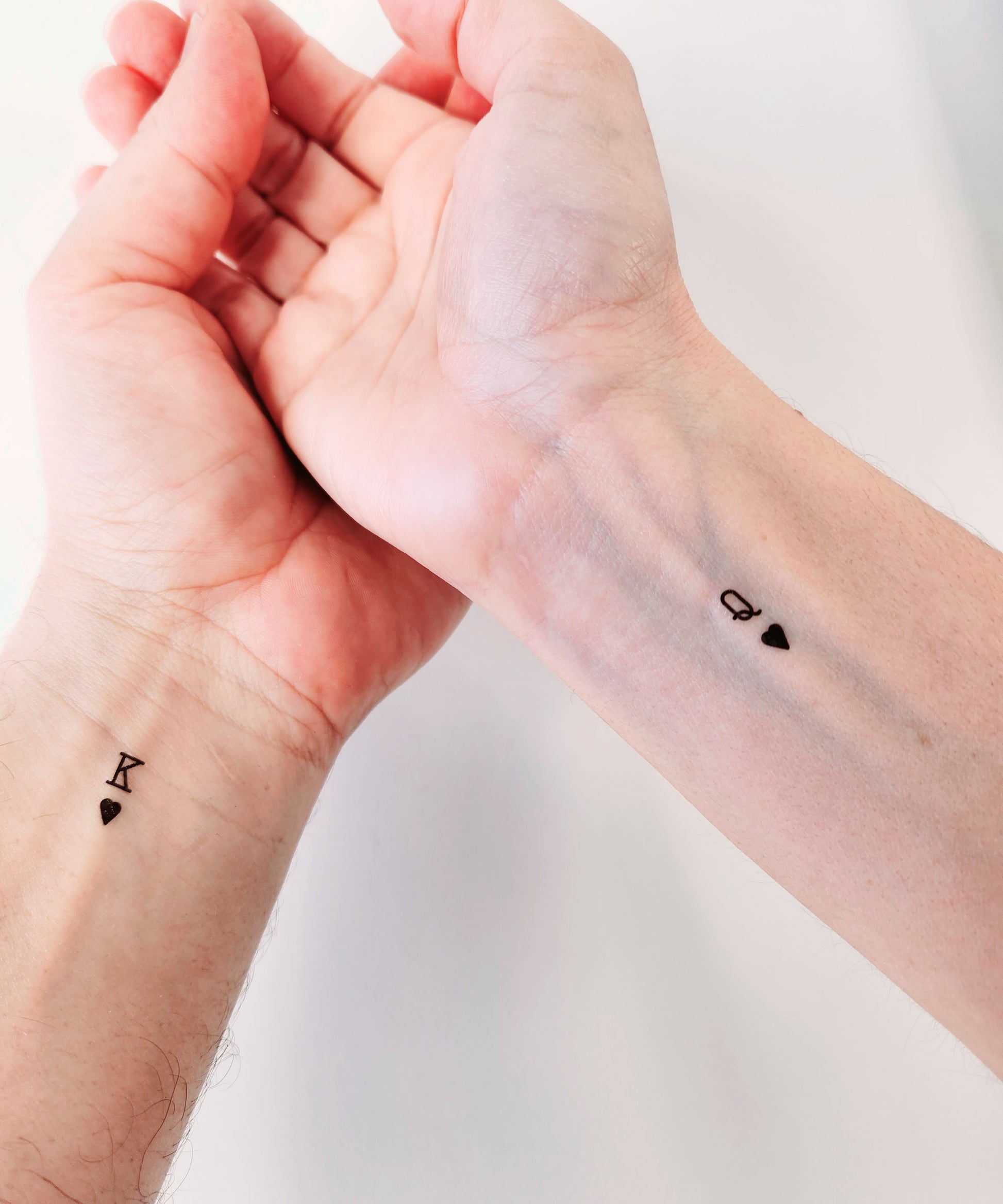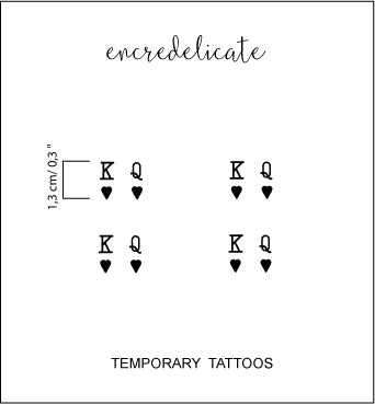 tatouages temporaires king et queen avec coeur minuscule de dimension environ 13 mm en noir, à offrir à son Valentin ou pour un mariage.