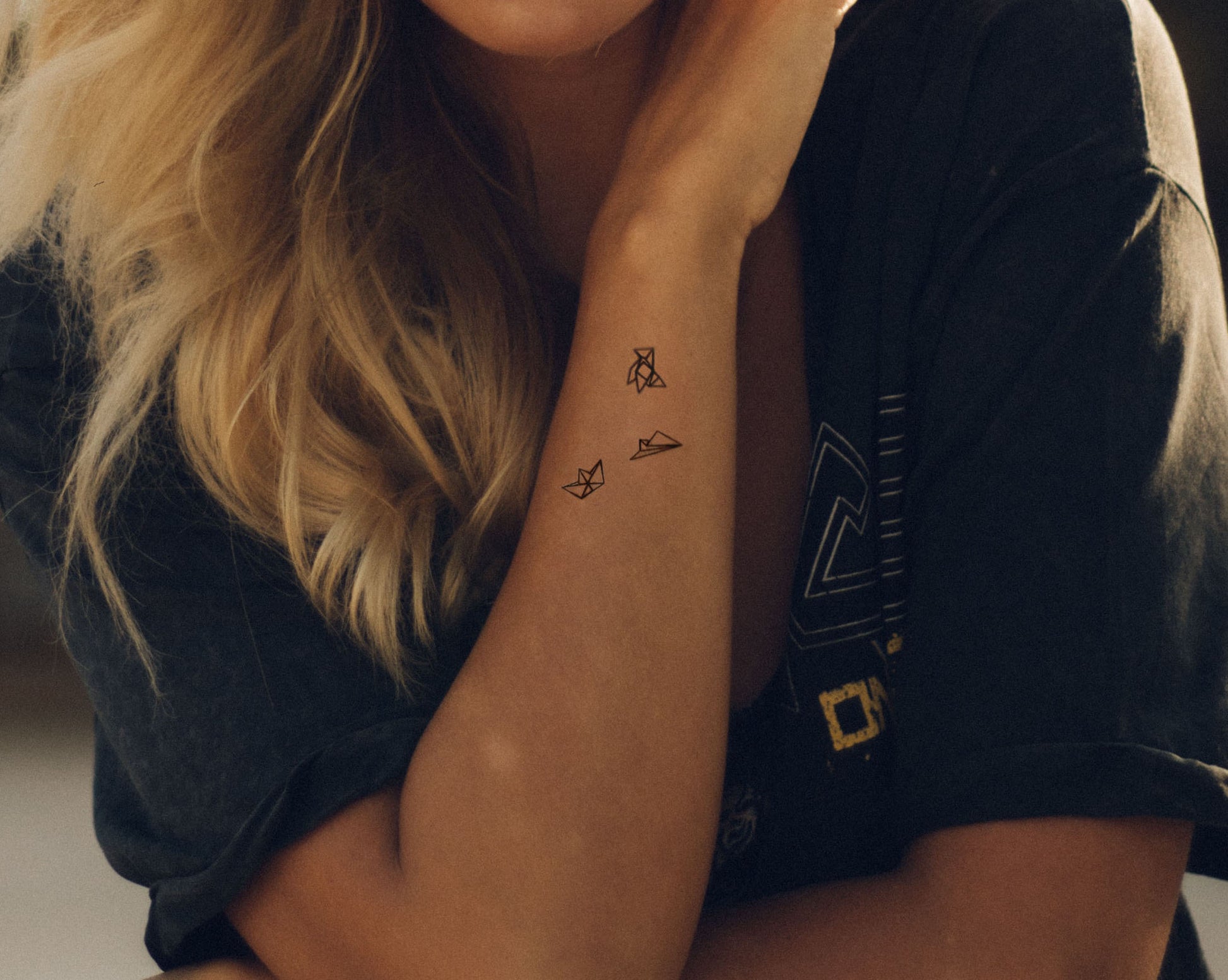 Petits tatouages temporaires minimalistes d'un bateau, d'un avion d'une cocotte en papier façon origami. Ces petits tatouages discrets et féminins trouveront très vite leur place sur vous sur le bras, la jambe, la nuque ou ailleurs (excepté près des yeux et muqueuses).
